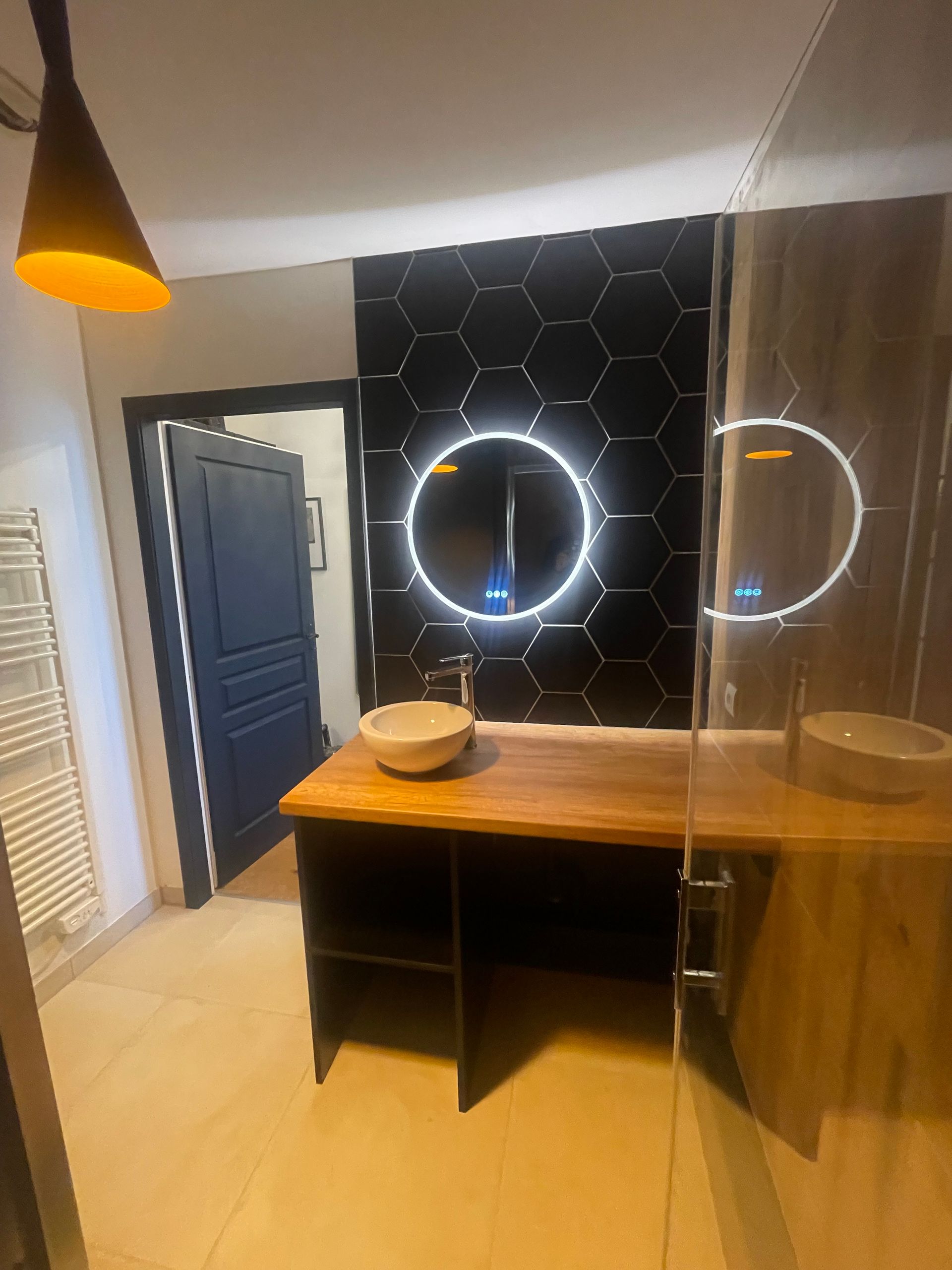 Sanitaire: douche, baignoire, lavabo, évier, WC suspendu