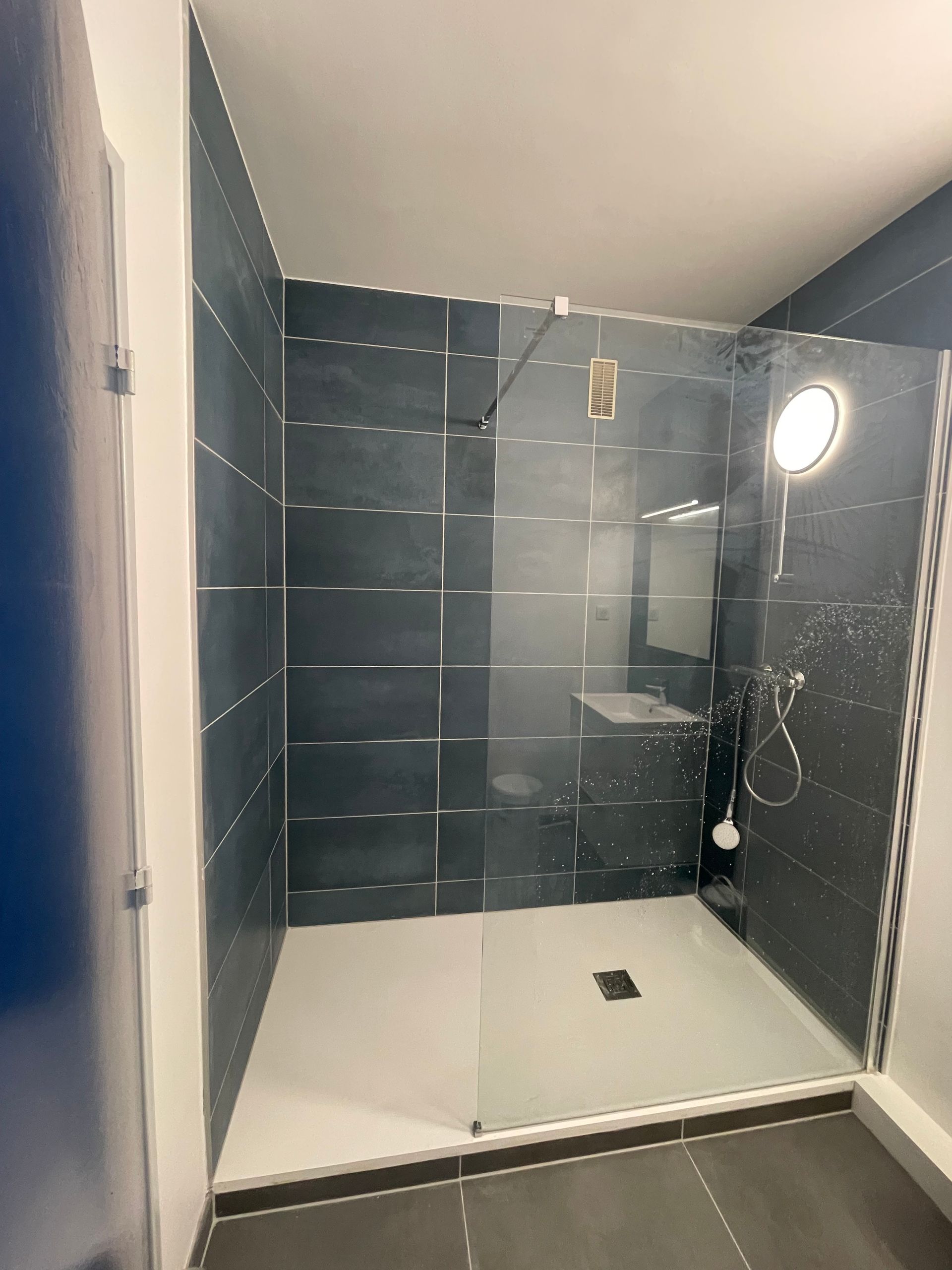 Sanitaire: douche, baignoire, lavabo, évier, WC suspendu